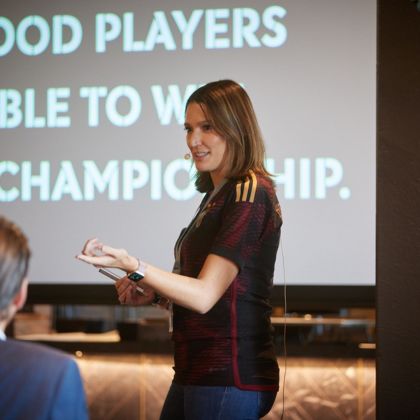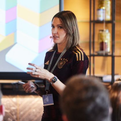 Sie hat die Fähigkeit, komplexe psychologische Zusammenhänge greifbar zu machen und direkt in den Alltag von Führungskräften und Teams zu übersetzen. Ob im Stadion, im Workshopraum oder auf der Bühne: Sie spricht offen über Druck, Zweifel, Motivation und Verantwortung und zeigt, wie mentale Stärke trainierbar wird.